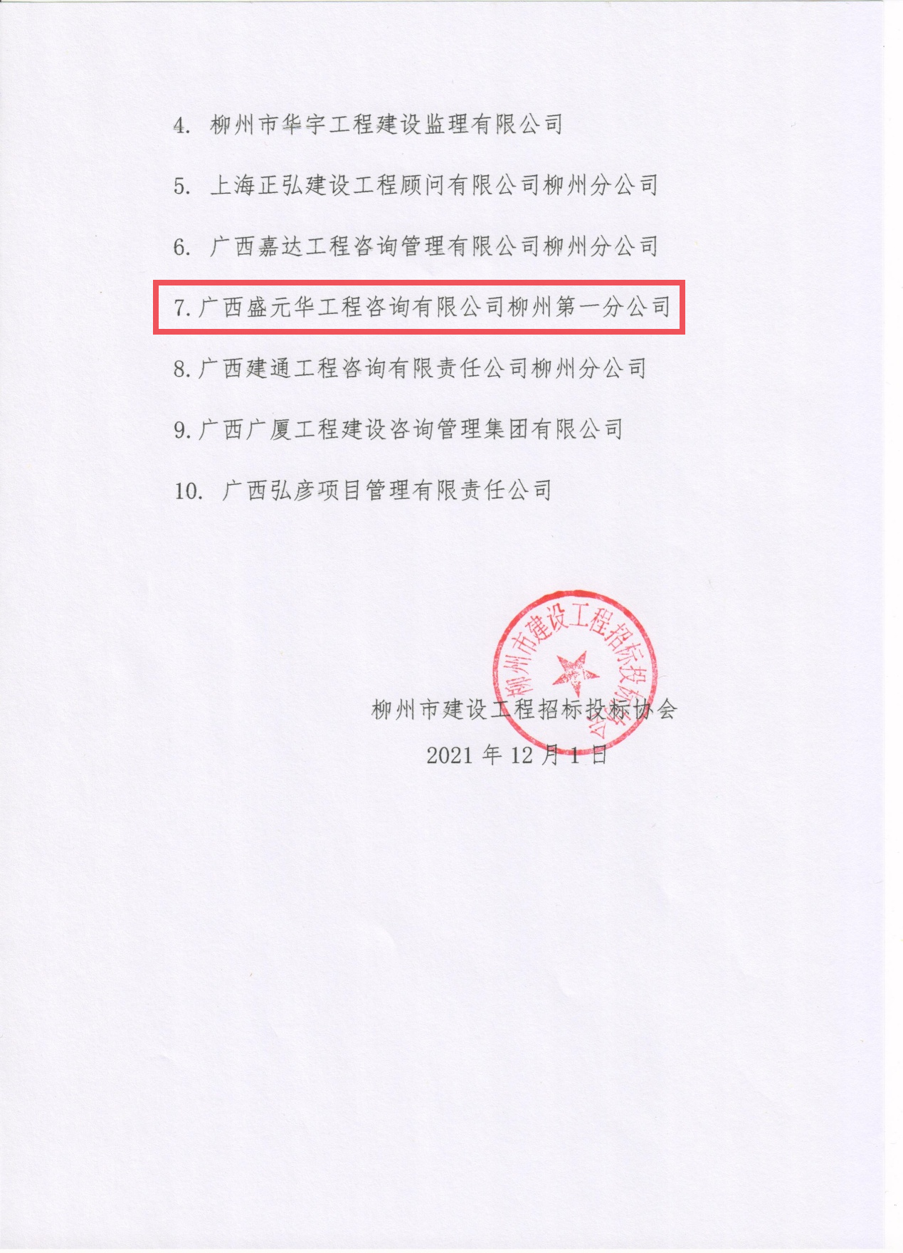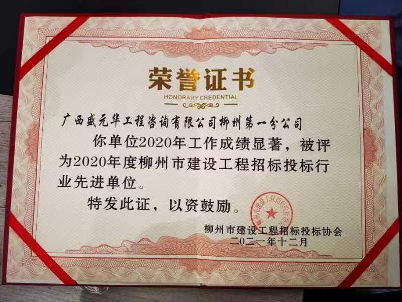 | 喜訊!熱烈祝賀廣西盛元華集團(tuán)旗下柳州一分公司榮獲2020年度"柳州市建設(shè)工程招標(biāo)代理行業(yè)先進(jìn)單位"的榮譽(yù)稱號 |